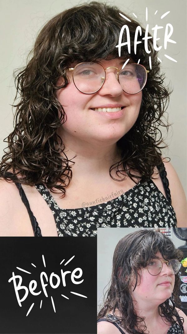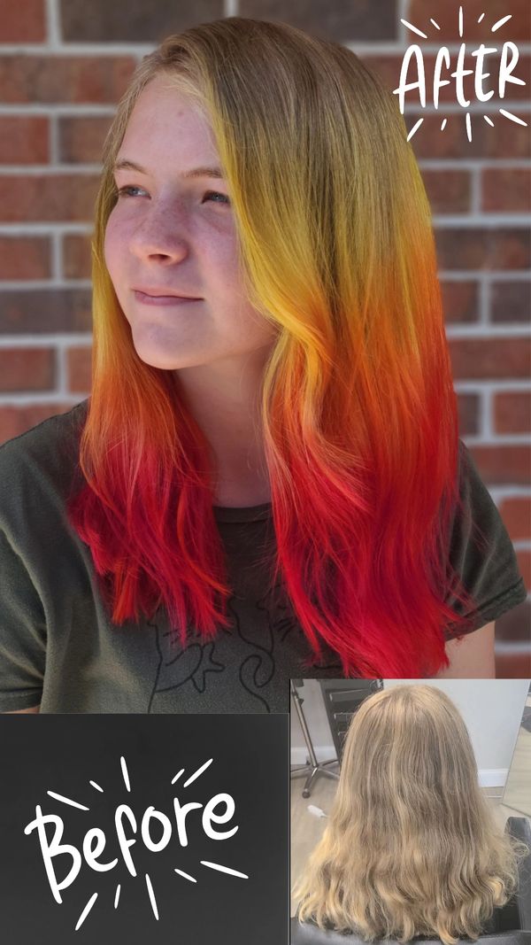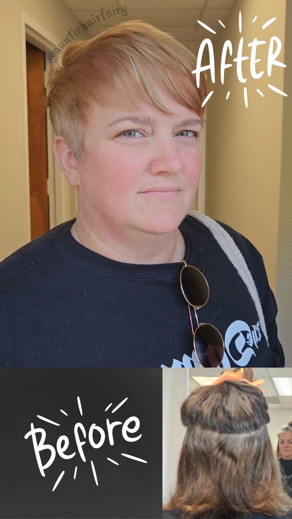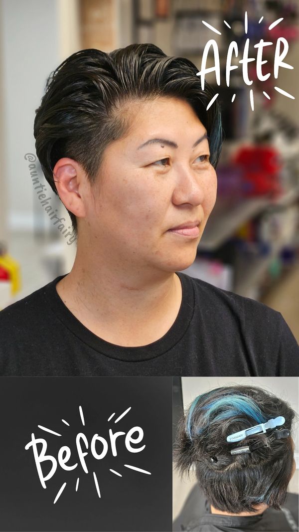 My happy place is creating fantasy colors, which I like to call "unicorn hair" which is the thing I'd do every day for FREE if money were no object! To be fair, I love the challenge of hair color in general, including creating lived in color magic from old grown out hair color, adding "peek-a-boo" pops of color with your natural hair or tape-ins, grey coverage AND I excel at corrective color! When cutting, I enjoy shaggy, highly texturized haircuts and giving a blow out on long layers is LIFE. My goal is to provide a relaxing, inclusive salon experience in a no judgement zone.